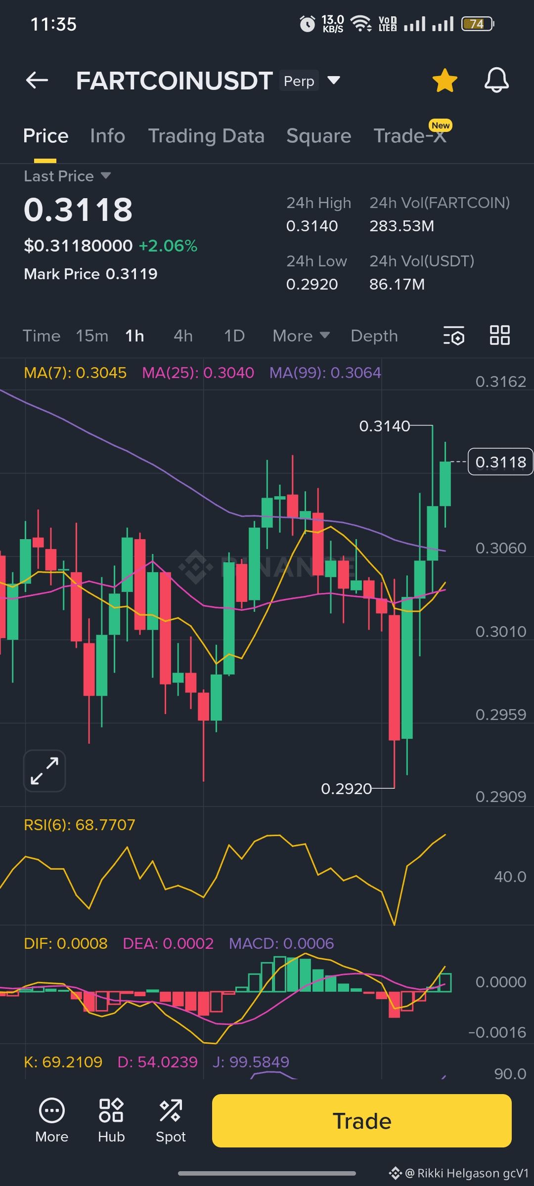 I managed to enter this trade at a very strategic point, and I am currently sitting in solid profit. Taking a look at the chart, the price is trading around 0.3118, showing a significant recovery from the 24-hour low of 0.2920.