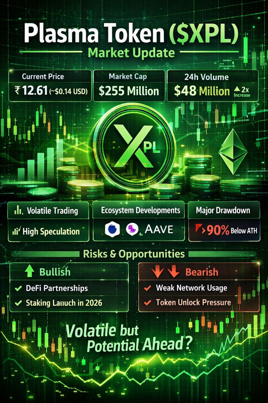 Plasma’s native token $XPL has been experiencing continued market volatility, with price action reflecting broader sentiment swings since its mainnet launch last year. According to recent live price feeds, 1 XPL is trading around ₹12.61 (~$0.14 USD), showing a slight uptick of about 3.5% in INR terms over 24 hours indicating modest intraday recovery after prolonged weakness. The market cap sits near $255 million, with trading volume rising sharply — almost doubling in the last 24 hours to around $48 million — pointing to renewed trader interest despite low long-term confidence metrics on chartThe current valuation remains far below its earlier levels. At launch in September 2025, Xpldebuted with a market capitalization exceeding $2.4 billion and reached a peak price above $1.50 on major exchanges like Binance and OKX