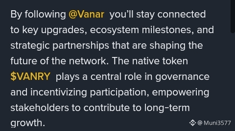 Seguendo @Vanar rimarrai connesso ai principali aggiornamenti, traguardi dell'ecosistema e partnership strategiche che stanno plasmando il futuro della rete. Il token nativo $VANRY gioca un ruolo centrale nella governance e nell'incentivare la partecipazione, dando potere ai portatori di interesse di contribuire alla crescita a lungo termine.