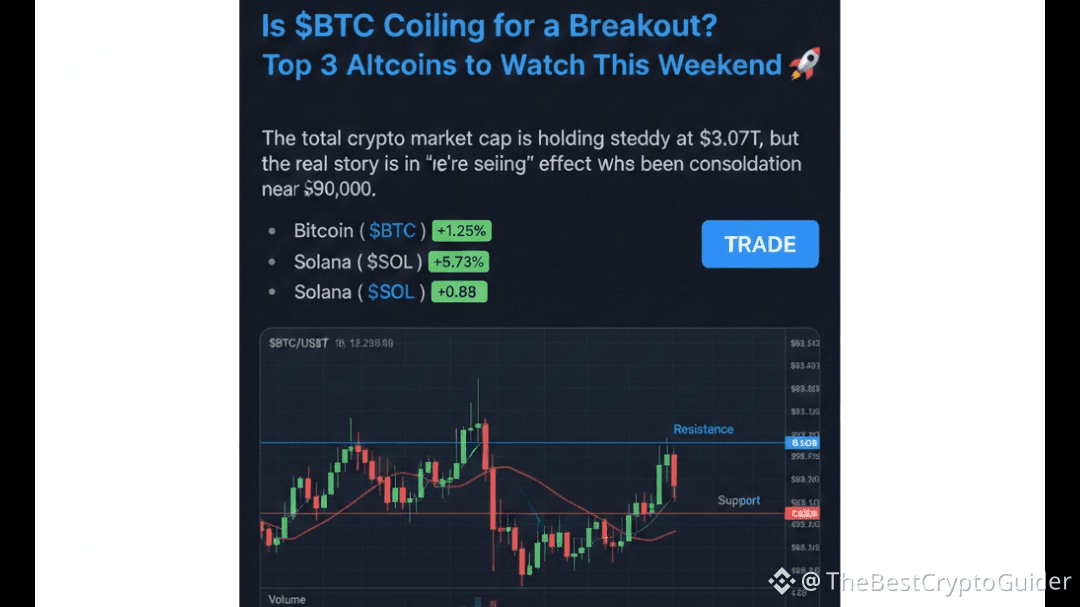 La capitalizzazione totale del mercato crypto si mantiene stabile a $3.07T, ma la vera storia è nell'effetto di "coil" che stiamo vedendo. Bitcoin ($BTC) si è consolidato vicino ai $90k, e la storia ci dice che quando la volatilità si comprime in questo modo, il prossimo movimento è solitamente esplosivo.