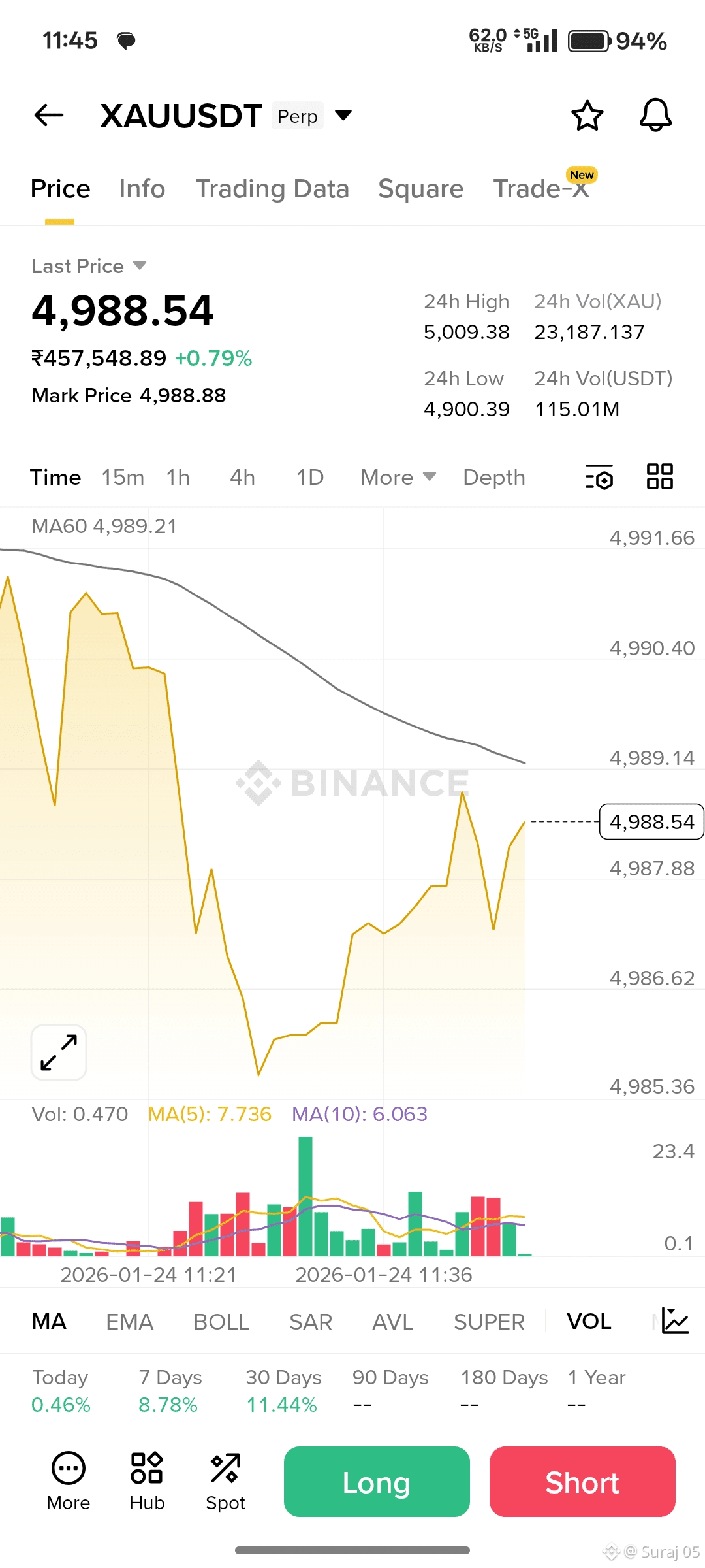 Gold (XAUUSDT): Currently trading at $4,988.54. After flirting with the $5,000 milestone, the price is showing a minor intraday retracement but remains up +0.79% for the day.