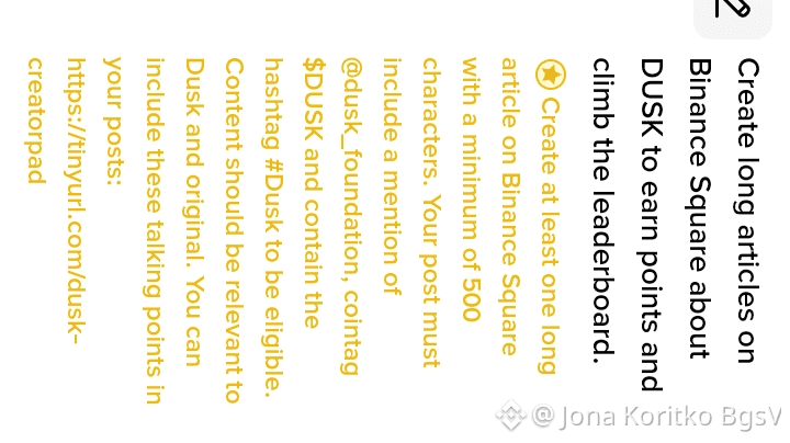 All'inizio del 2026, Binance Square ha ampliato drasticamente il suo ecosistema di contenuti social ospitando una campagna CreatorPad che mette in evidenza progetti blockchain emergenti, e nessuno sta ricevendo più attenzione di @dusk_foundation e il suo token nativo $DUSK. Questa iniziativa invita creatori e costruttori di comunità a interagire con il Dusk Network completando una serie di compiti giornalieri — come pubblicare contenuti originali su Binance Square — per guadagnare punti e competere in una classifica per una parte di un sostanzioso montepremi. La campagna Dusk si svolge dall'8 gennaio al 9 febbraio 2026, offrendo un totale di 3,059,210 $DUSK in premi, che rappresenta un incentivo significativo sia per i creatori di contenuti esperti che per i nuovi partecipanti. �@Dusk $DUSK #Dusk.