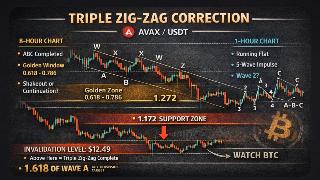 L'azione del prezzo di AVAX continua a riflettere un ambiente correttivo complesso, con dinamiche di struttura e liquidità che giocano un ruolo più importante rispetto a un semplice bias direzionale. Sul time frame più alto, il comportamento a zig-zag triplo in corso suggerisce che il mercato è ancora in una fase di distribuzione piuttosto che nello sviluppo di una tendenza impulsiva, mentre i frattali a time frame più bassi rivelano cicli correttivi ripetuti che tentano di trovare un equilibrio. Il prezzo che reagisce intorno alle zone chiave di estensione di Fibonacci come 1.272 e 1.618 evidenzia la battaglia tra la liquidità speculativa a breve termine e la continuazione della tendenza di grado superiore, specialmente mentre AVAX scambia all'interno di aree in cui il clustering degli stop-loss e gli ordini in attesa tendono ad accumularsi. Sebbene i ritracciamenti locali e gli impulsi micro possano dare l'apparenza di un'inversione, il contesto più ampio rimane fortemente influenzato dal sentiment generale del mercato e dal controllo direzionale di Bitcoin, il che significa che la forza o la debolezza isolata di AVAX è probabile che sia temporanea a meno che non sia confermata dalla struttura a time frame più alto. Fino a quando un chiaro livello di invalidazione non sarà riconquistato con un forte volume e un seguito impulsivo, il comportamento del prezzo dovrebbe essere visto come correttivo, con eventuali movimenti al rialzo trattati come potenziali ritracciamenti piuttosto che cambi di tendenza. Questa prospettiva enfatizza la pazienza, la conferma strutturale e la gestione del rischio rispetto alla previsione, poiché le correzioni complesse spesso si risolvono più lentamente e in modo più ingannevole di quanto i trader si aspettino.