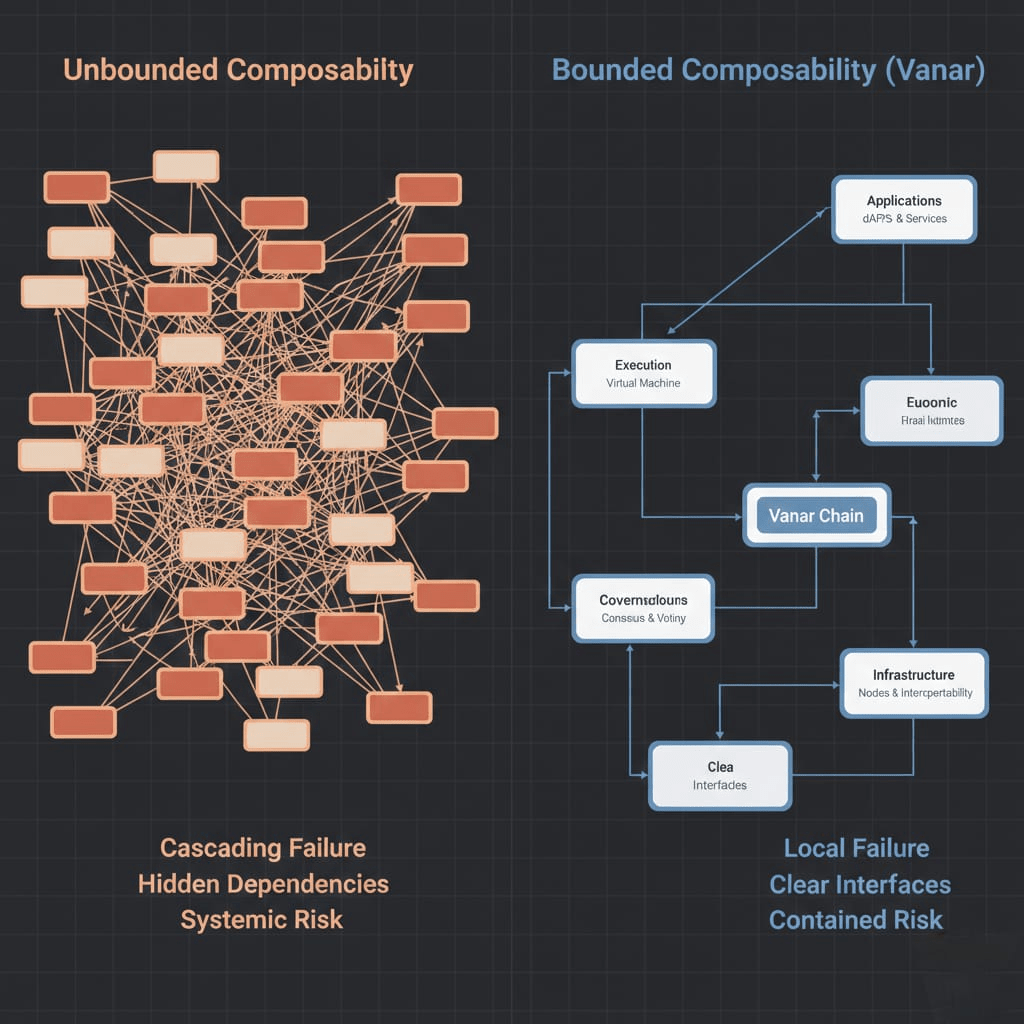 La Vanar Chain si avvicina alla composabilità con una restrizione insolita. Invece di massimizzare quanto può connettersi, si concentra su come le connessioni sono limitate. Questa distinzione sembra sottile, ma ha profonde conseguenze su come la rete evolve.