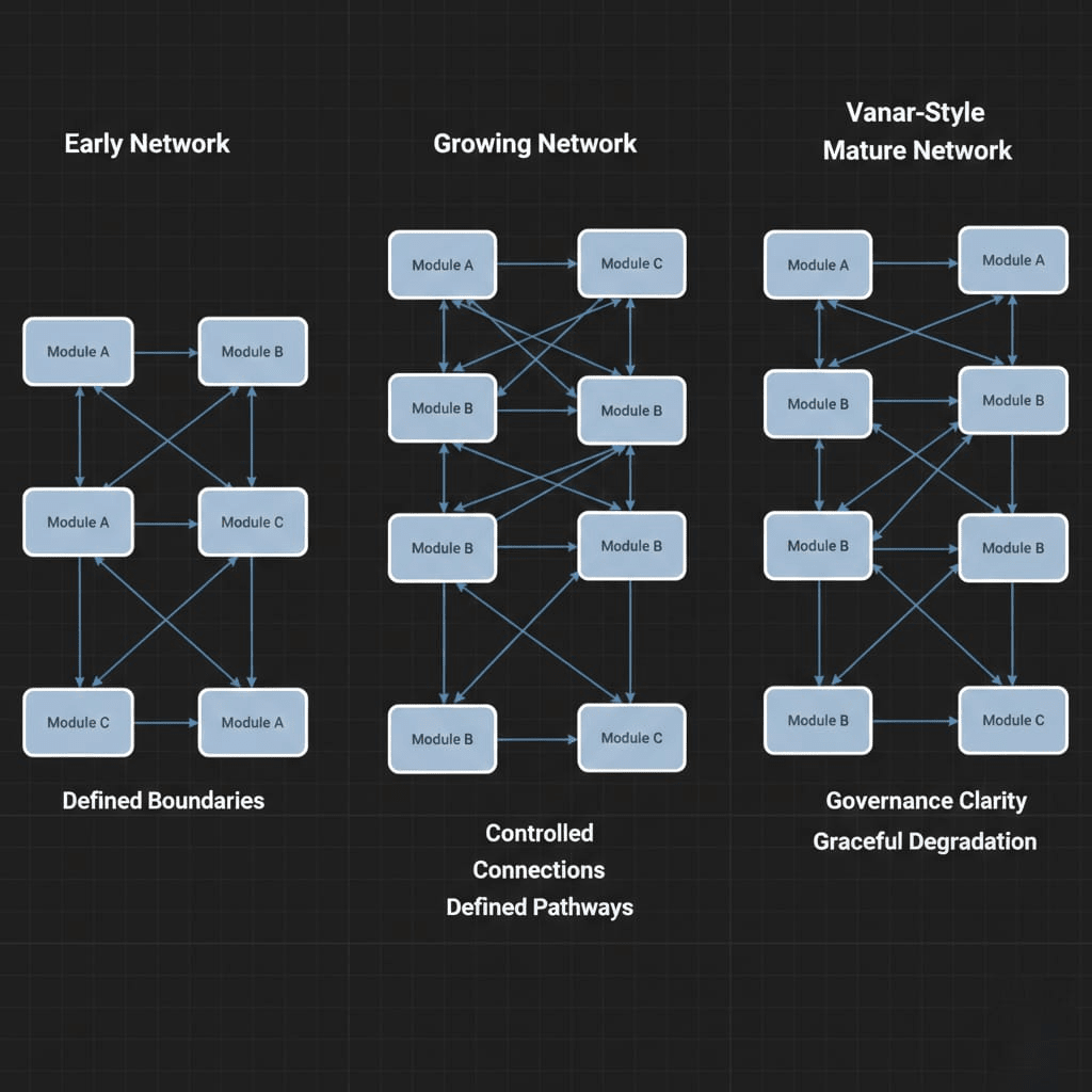 Disincentivando l'eccessiva interdipendenza, la rete riduce la possibilità che aggiornamenti non correlati destabilizzino sistemi critici. I costruttori sono spinti verso design autonomi che degradano in modo elegante piuttosto che catastrofico.