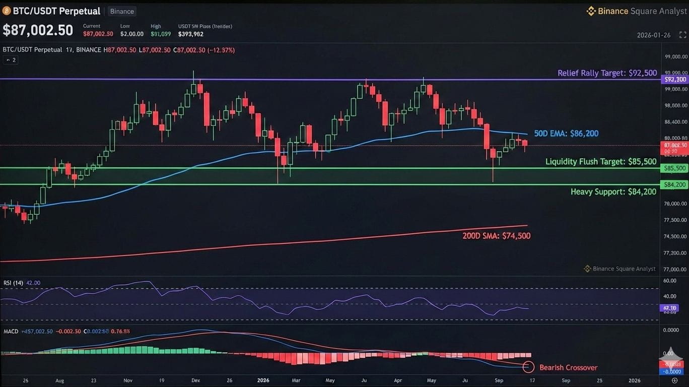 Medie Mobili: Bitcoin è attualmente in fase di oscillazione appena sopra il suo EMA a 50 giorni ($86,200). Storicamente, una chiusura giornaliera al di sotto di questo livello ha portato a un nuovo test della SMA a 200 giorni, attualmente fissata a $74,500.