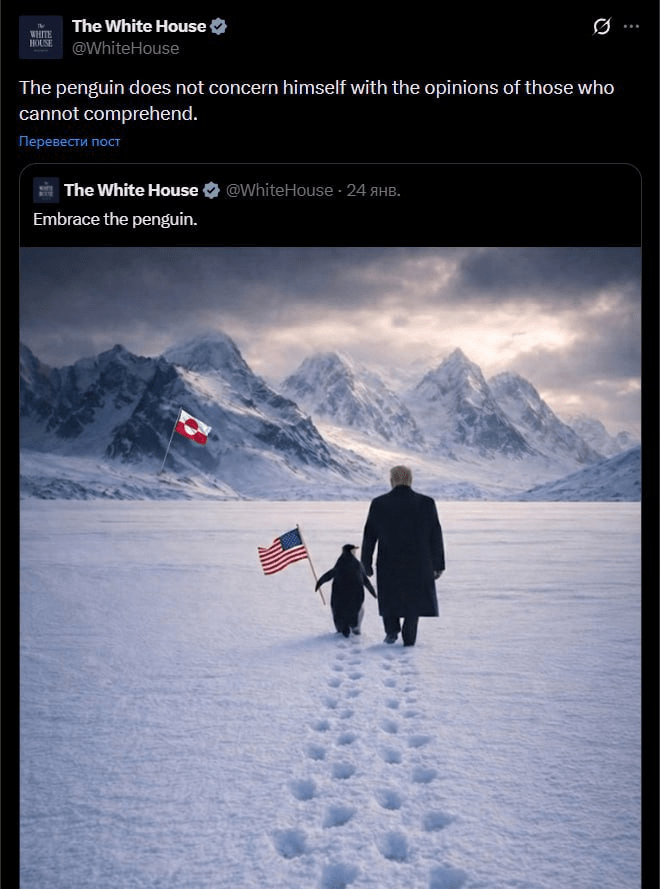 La Casa Bianca ha pubblicato un TikTok e un'immagine su X che mostrano un pinguino e la bandiera della Groenlandia.