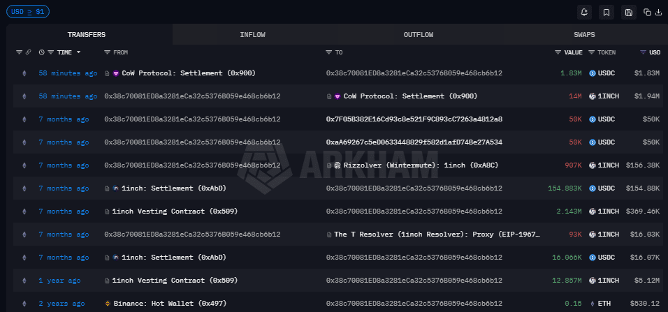 Questo wallet ha ricevuto 15 milioni di 1INCH tramite il pagamento del vesting di un anno fa.