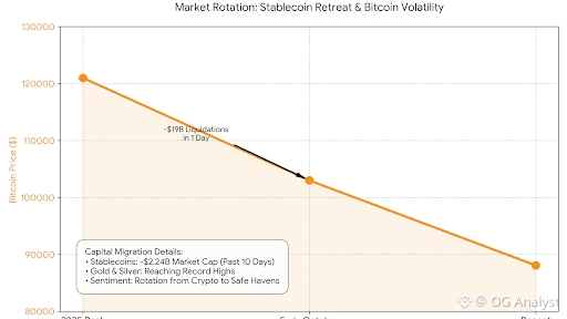 È una distinzione sottile ma importante. Le stablecoin non stanno fallendo; la loro capitalizzazione di mercato sta semplicemente contractando perché i detentori stanno temporaneamente riallocando per preservare valore. Questo è un segnale riflessivo sul sentimento degli investitori: la sicurezza sta avendo la precedenza sulla ricerca di rendimenti.