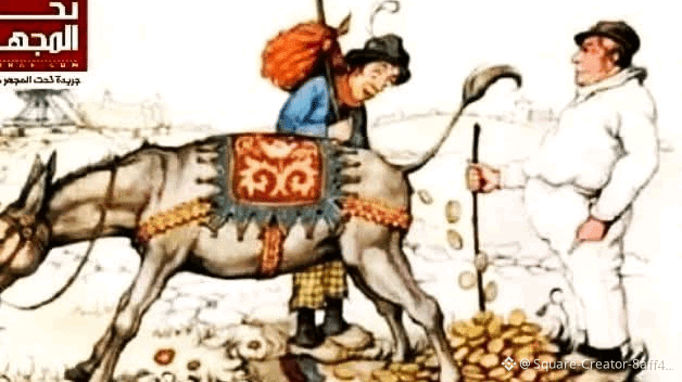 Il truffatore e sua moglie decisero di andare in una città e truffare i suoi abitanti, e quando arrivarono in città, comprarono un asino e riempirono la sua bocca d'oro e ogni volta che ragliava, cadevano dalla sua bocca i soldi