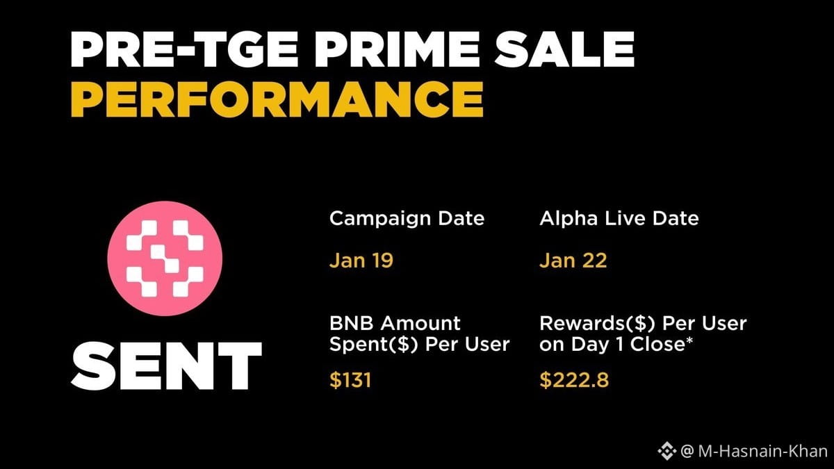 Il recente $SENT Pre-TGE su Binance Wallet Prime Sale ha fornito forti segnali iniziali, con gli utenti che hanno speso in media circa $131 e guadagnato circa $222.8 in ricompense al termine del Giorno 1. Questa performance ha evidenziato una forte domanda iniziale e ha stabilito un solido benchmark per i prossimi eventi di Prime Sale.