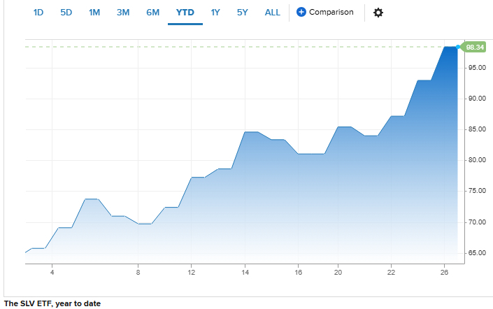 Con l'eccitazione che ha caratterizzato l'afflusso di lunedì, l'iShares Silver Trust è salito di quasi il 6%, portando il suo guadagno dal 2026 a oltre il 52%, e prolungando il sorprendente aumento di quasi il 145% dell'anno scorso. La scorsa settimana, il prezzo dell'argento ha superato per la prima volta nella storia i 100 dollari l'oncia.
