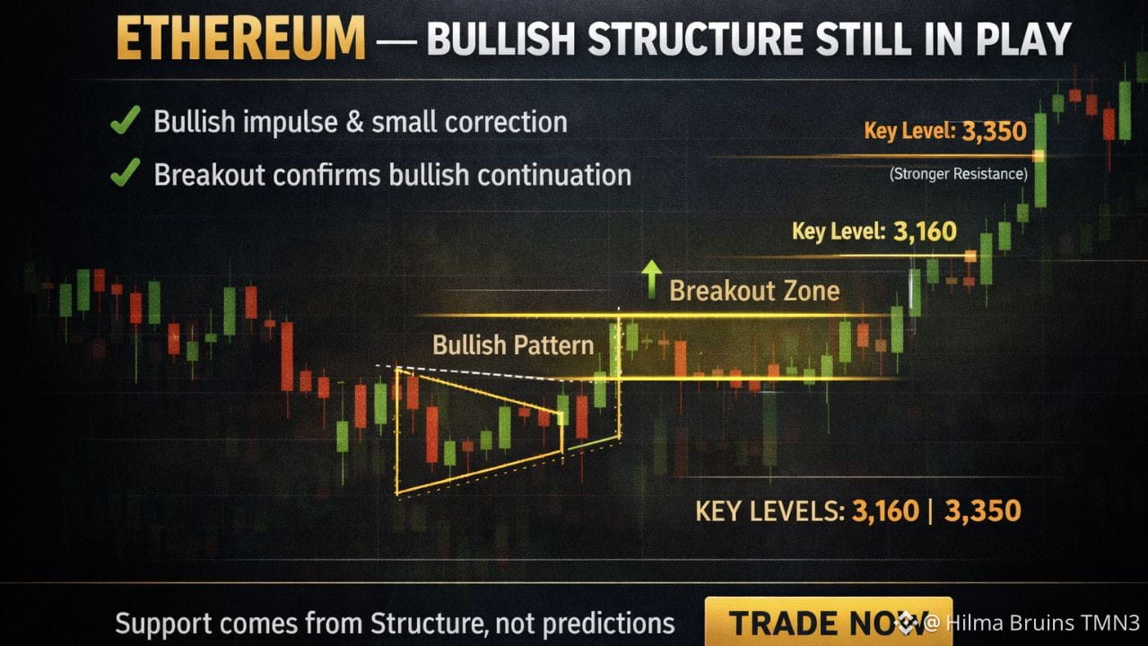 Ethereum ha stampato un forte impulso rialzista, seguito da un ritracciamento controllato — esattamente il tipo di comportamento dei prezzi che vuoi vedere in un trend al rialzo sano. Questa struttura si allinea con un classico setup di continuazione rialzista, non di debolezza. Il prezzo ha ora superato il modello correttivo, che è un importante segnale di conferma. Finché $ETH continua a mantenersi al di sopra di questa zona di breakout, la probabilità favorisce una continuazione al rialzo piuttosto che un ritracciamento più profondo. Il primo obiettivo al rialzo si trova intorno al livello 3.160, una precedente zona strutturale chiave dove è probabile che ci siano reazioni. Se il momentum rialzista rimane intatto, ETH potrebbe estendersi più in alto verso l'area 3.350, dove ci si aspetta una resistenza più forte. Nessuna previsione — solo lettura della struttura e reazione ai prezzi. Il contesto completo e i livelli sono visibili sul grafico.