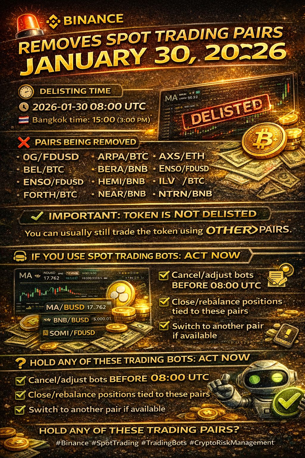 🚨 Sono Storiesofcoins — avviso veloce: Binance sta rimuovendo più coppie di trading spot il 30 gennaio 2026. Se scambi una di queste coppie o utilizzi bot, agisci prima della scadenza.