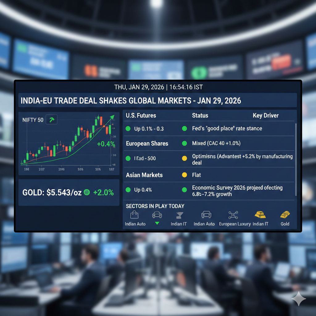 La sessione commerciale globale è attualmente definita da due enormi narrazioni: l'**Accordo di Libero Scambio India-UE (FTA)** e la **sfida della Federal Reserve** alla pressione politica.
