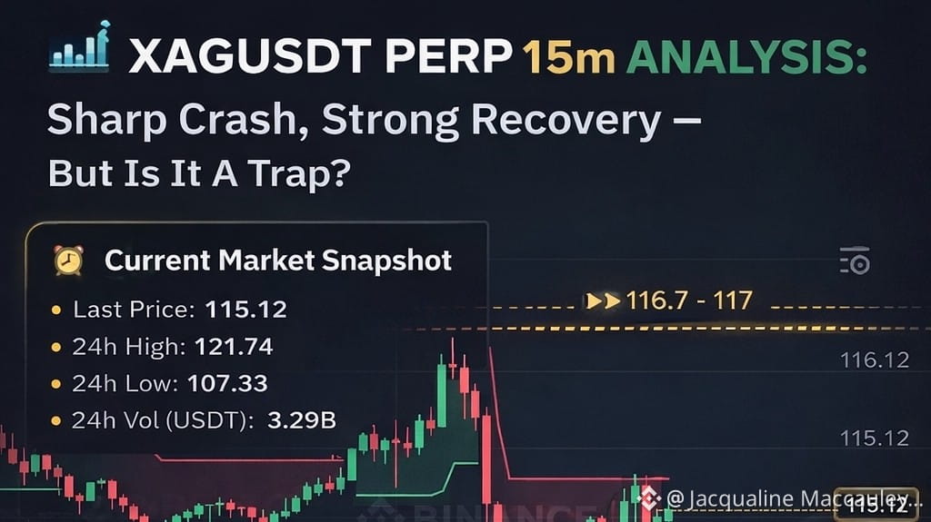 XAGUSDT Perp (Argento) sta attualmente mostrando una struttura di prezzo aggressiva sul timeframe di 15 minuti. Il mercato ha subito un grande crollo dalla zona 121, seguito da un rapido rimbalzo di recupero, riportando il prezzo vicino a 115 USDT.