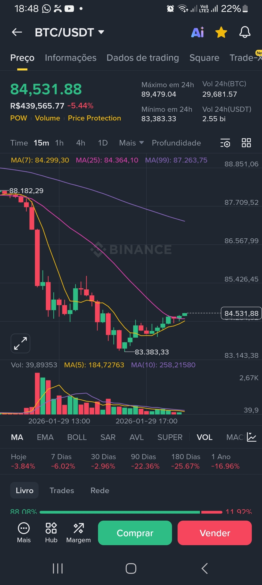 $BTC Oggi, il grafico BTC/USDT su Binance rivela uno scenario di forte correzione nel mercato. Il prezzo attuale del Bitcoin è di US$ 84.531,88, con un calo del -5,44% nelle ultime 24 ore. In reais, ciò rappresenta R$ 439.565,77 — un ritracciamento significativo che accende allerta e opportunità.