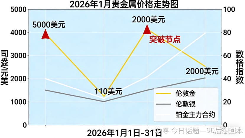 (2026年1月贵金属价格走势图——标注伦敦金、伦敦银、铂金主力合约价格曲线,突出5000美元、110美元、2000美元关键关口突破节点)