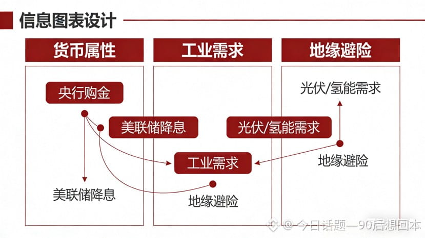 (贵金属上涨驱动因素图谱——分为货币属性、工业需求、地缘避险三大板块,标注央行购金、美联储降息、光伏/氢能需求等关键节点)