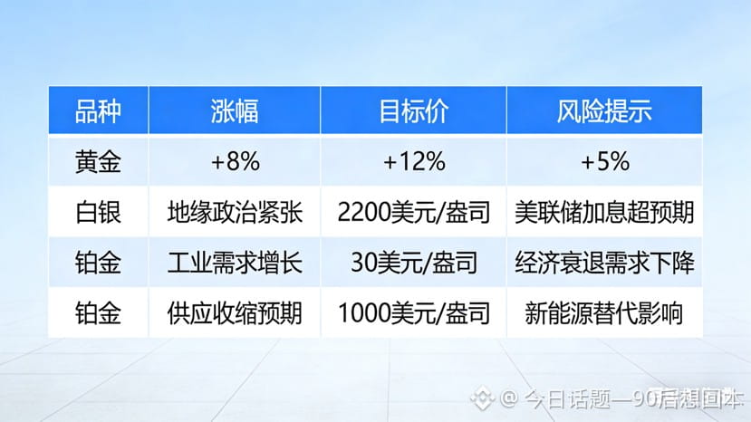 (2026年贵金属品种涨跌幅与核心逻辑对比表——包含品种、涨幅、驱动逻辑、目标价、风险提示五列)