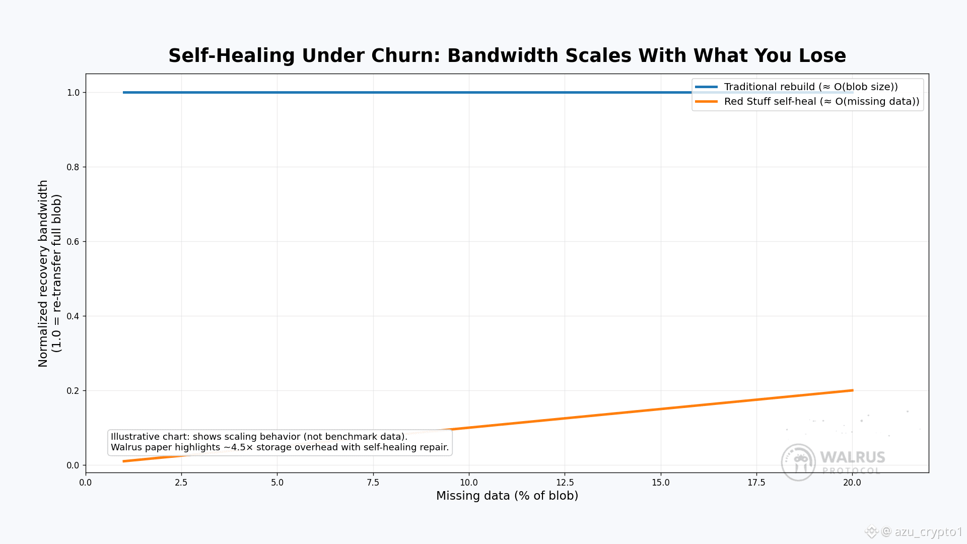 这也解释了为什么 Walrus 敢说自己是“自愈系统”:协议本身就鼓励并驱动节点在背后不断把局部缺失补齐,直到每个正确节点都重新完整持有它应有的 sliver 集合,而不用依赖某个中心化协调者来下命令。当你把这个过程放到一个长时间运行的存储网络里,就会发现它在不断自动找平网络里的“小坑”,而不是等出事再来一次“大手术”。