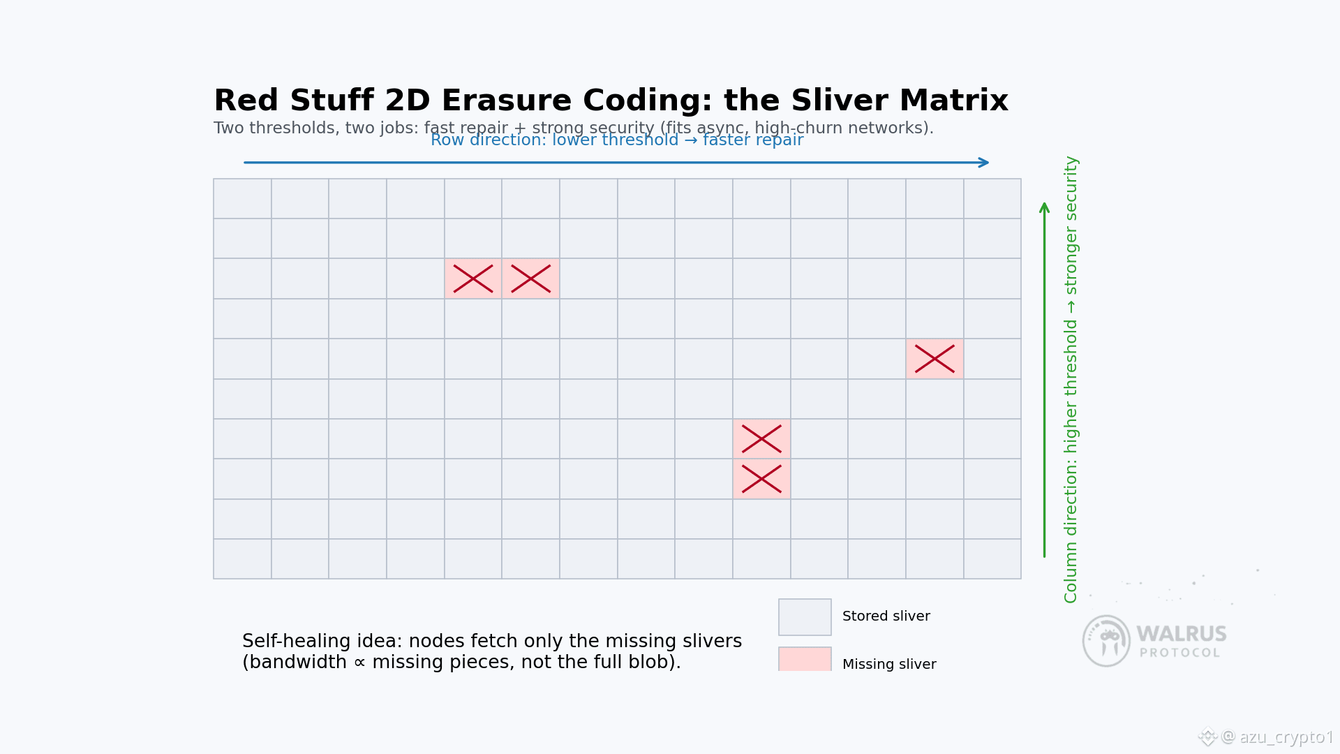 说人话就是:在一个节点经常上下线、延迟不可预测、还有坏人混在里面“薅羊毛”的开放网络里,你要保证数据既不丢,又能随时通过挑战机制抓住装死的节点,而且这一切不能以“十几二十倍冗余”为代价。Red Stuff 的思路非常有意思,它用的是二维纠删编码,而不是传统的一维切片。你可以脑补一张矩阵,把一个大 blob 按照行和列两种维度切成很多“碎片块”(Walrus 里叫 slivers),每个单元格都是一小块编码后的数据。一旦这么排好,你就可以在“行方向”和“列方向”分别做不同门槛的编码:某一维的阈值设置得相对低一点,方便恢复;另一维的阈值设置得更高,提供更强的安全冗余。