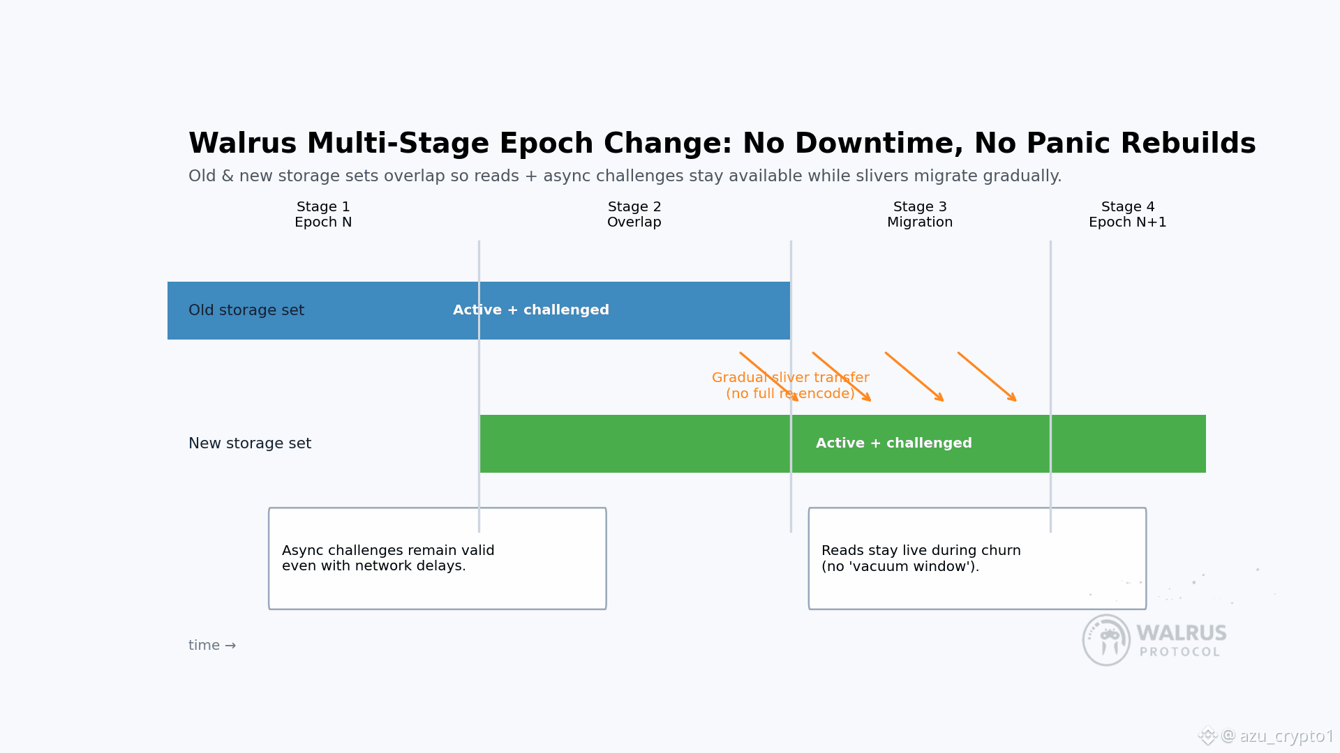 Walrus 的做法是引入一个多阶段的 epoch change 协议,把这件事拆成几个交叠的阶段来做。白皮书里给的描述是:这套多阶段的 epoch 变更机制天然适用于去中心化存储系统,能在节点 churn 的情况下保持高可用性。具体来说,新旧两套节点集在一段时间内会并行承担一部分职责,Red Stuff 那层二维编码让数据可以在两套集合之间渐进式迁移,期间对外提供的读取和挑战能力不至于中断或者明显劣化。
