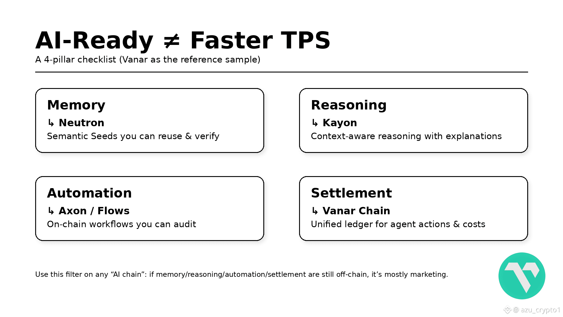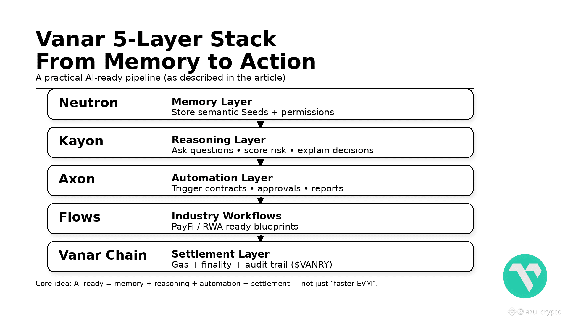 Venar 给出的答案,是一个五层栈:Neutron + Kayon + Axon/Flows + Vanar Chain + $VANRY。在这个结构下,“AI-ready” 不再是一句挂在首页的 marketing 文案,而是一个可以拆开、可以验证、可以对照其他 L1 的工程标准。