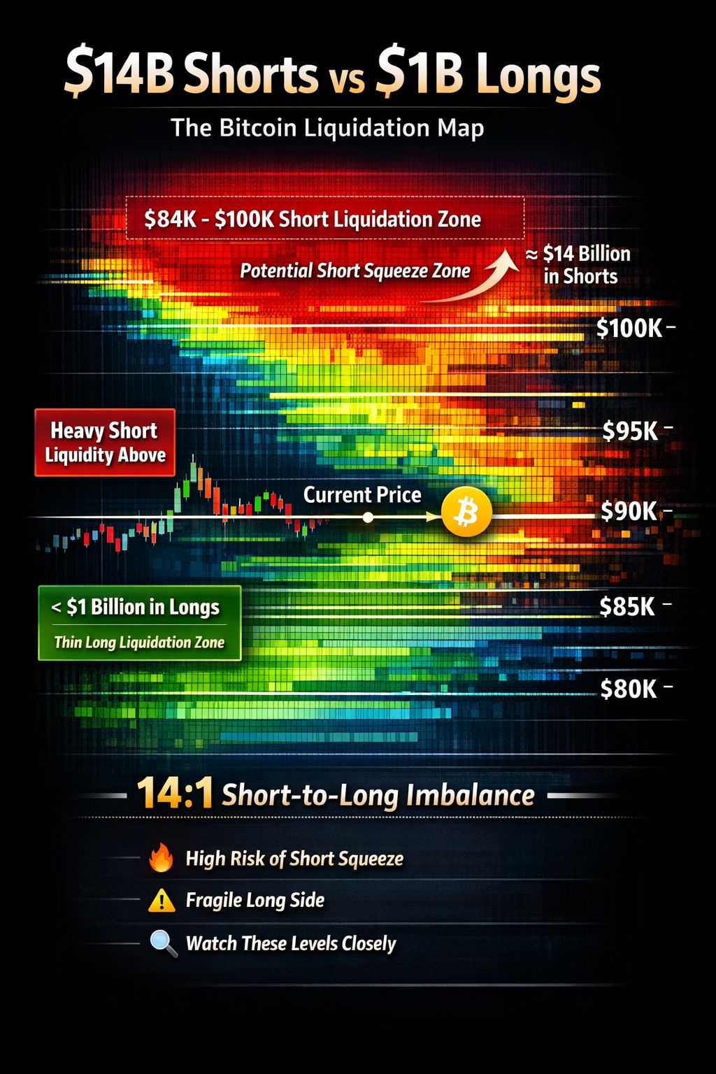 Secondo i dati di Coinglass, l'intervallo $84K–$100K è densamente affollato di liquidazioni corte.