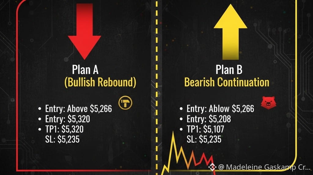 Piano Parametrico A (Rimbalzo rialzista) Piano B (Continuazione ribassista) Bias Tatticamente rialzista (Breve termine) Ribassista (Medio termine) Ingresso Sopra $5,266 (Aspetta il volume) Sotto $5,208 (Aspetta il breakdown) Prendi profitto 1 $5,320 (Resistenza immediata) $5,107 (Minimo swing precedente) Prendi profitto 2 $5,490 (Zona alta settimanale) $4,996 (Pavimento psicologico principale) Stop loss $5,235 $5,235