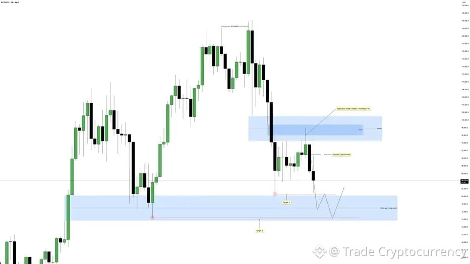 Bitcoin ha rifiutato un importante FVG settimanale e mensile, ha formato un CISD ribassista ed è ora strutturalmente allineato per ulteriori ribassi. L'attenzione rimane prima sull'Obiettivo 1, con l'Obiettivo 2 come obiettivo di continuazione se la momentum al lato di vendita persiste. La struttura complessiva supporta una visione ribassista per le prossime settimane.