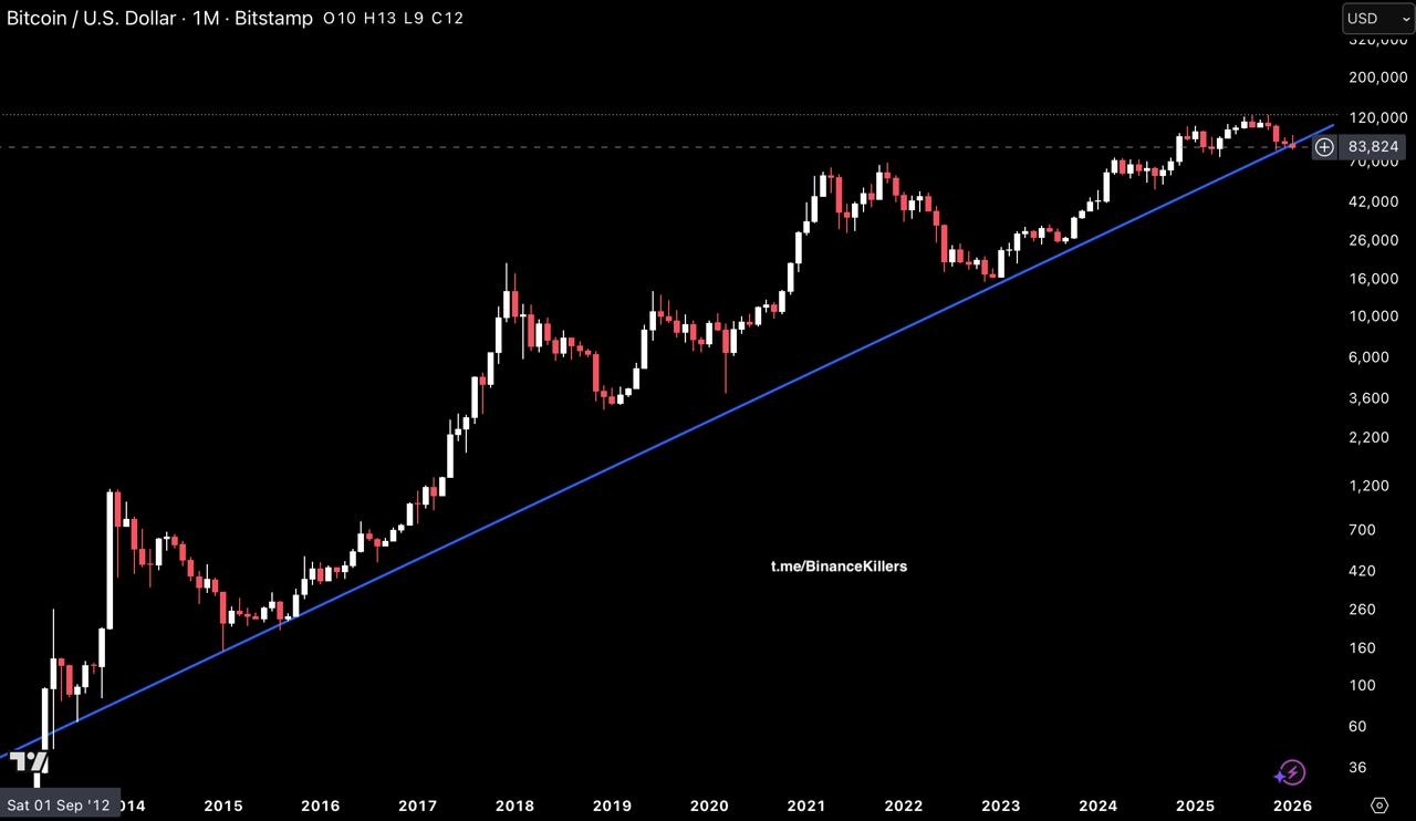 Il prezzo sta premendo sulla linea di supporto ascendente di lungo termine — un livello che ha definito la tendenza macro per 12 anni.
