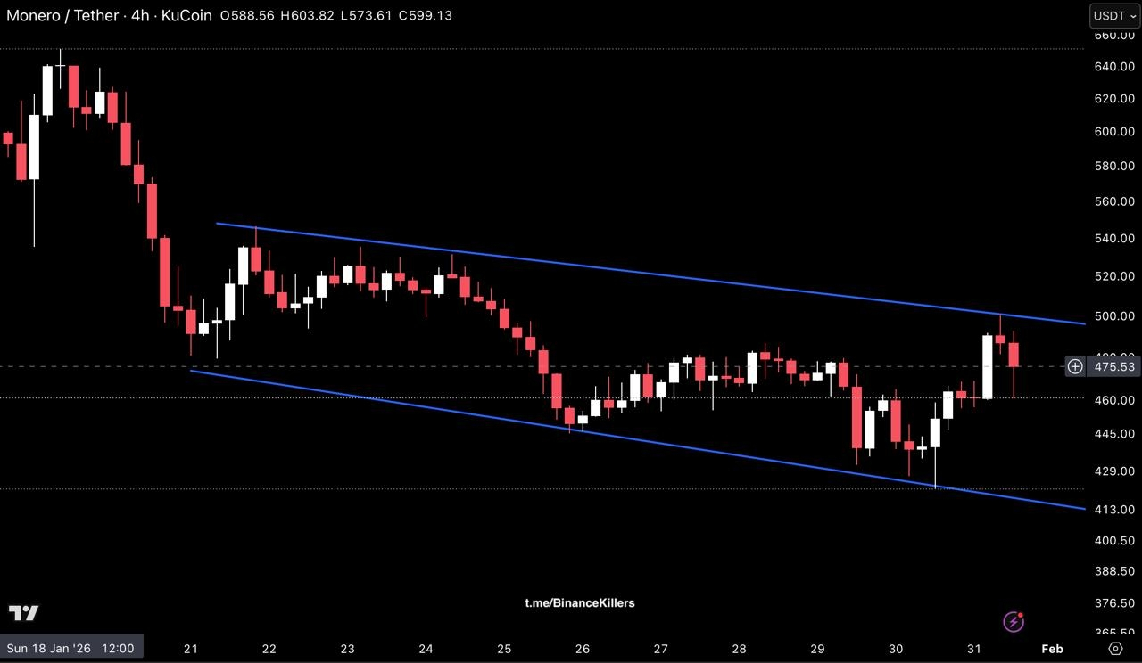$XMR continua a essere negoziato all'interno di un canale discendente, con il prezzo che reagisce nuovamente al di sotto della linea di tendenza superiore. Il recente movimento al rialzo è stato respinto vicino a 500, mantenendo la struttura correttiva invece di rialzista.
