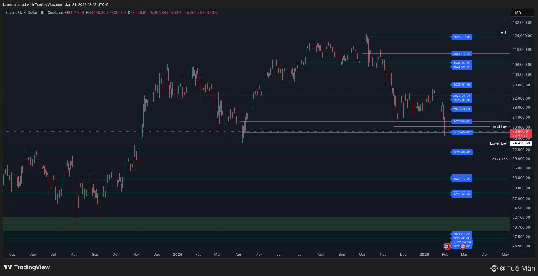 BTC lần đầu mất mốc 80.000 USD kể từ tháng 4/2025 và có thời điểm rơi xuống dưới 76.000 USD. Áp lực bán đẩy giá tiến sát vùng đáy tháng 4/2025 quanh 74.500 USD. Hơn 2,2 tỷ USD đã bị thanh lý trong 24 giờ qua.