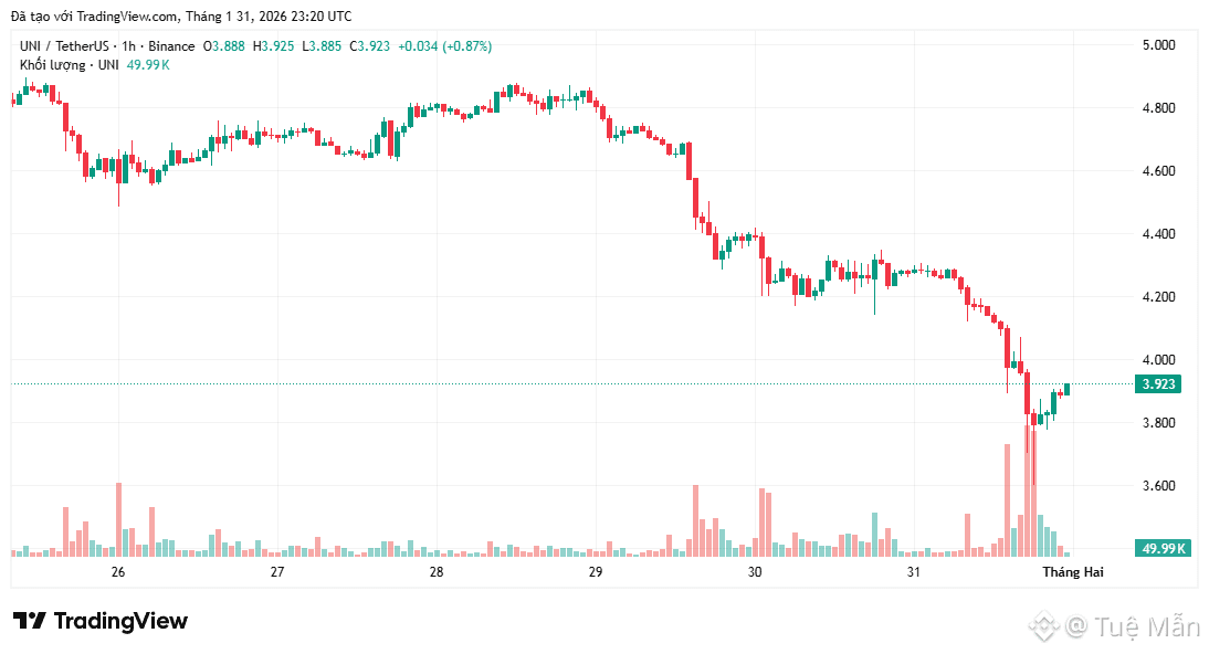 Tại thời điểm ghi nhận, UNI giao dịch quanh 3,9 USD, giảm gần 10% trong ngày, phản ánh mức biến động gia tăng.