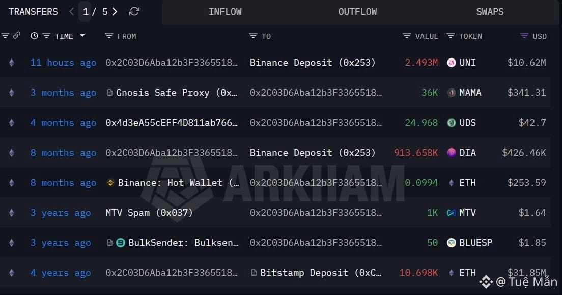Sau nhịp giảm sâu, một holder dài hạn đã bán ra toàn bộ vị thế. Theo dữ liệu Arkham, một ví cá voi không hoạt động trong 5 năm bất ngờ quay lại và bán 2,49 triệu UNI, thu về khoảng 10,62 triệu USD.