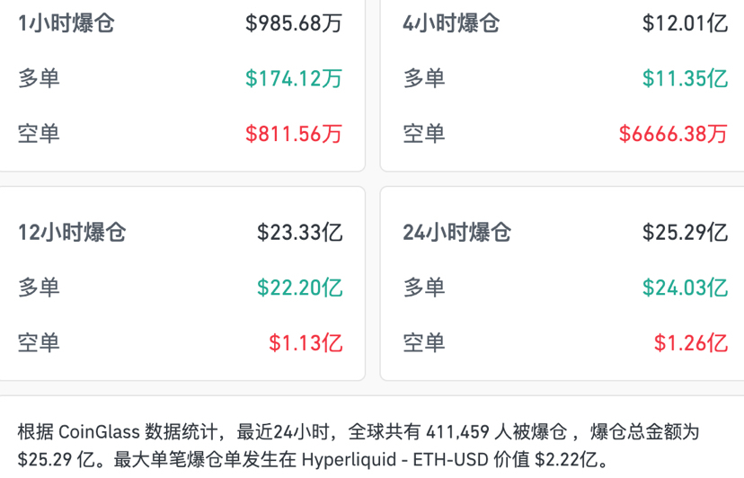 I dati di CoinGlass mostrano che nelle ultime 24 ore, oltre 410.000 persone in tutto il mondo sono state liquidate, con un importo di liquidazione che ha raggiunto 2,529 miliardi di dollari (circa 175,8 miliardi di yuan).