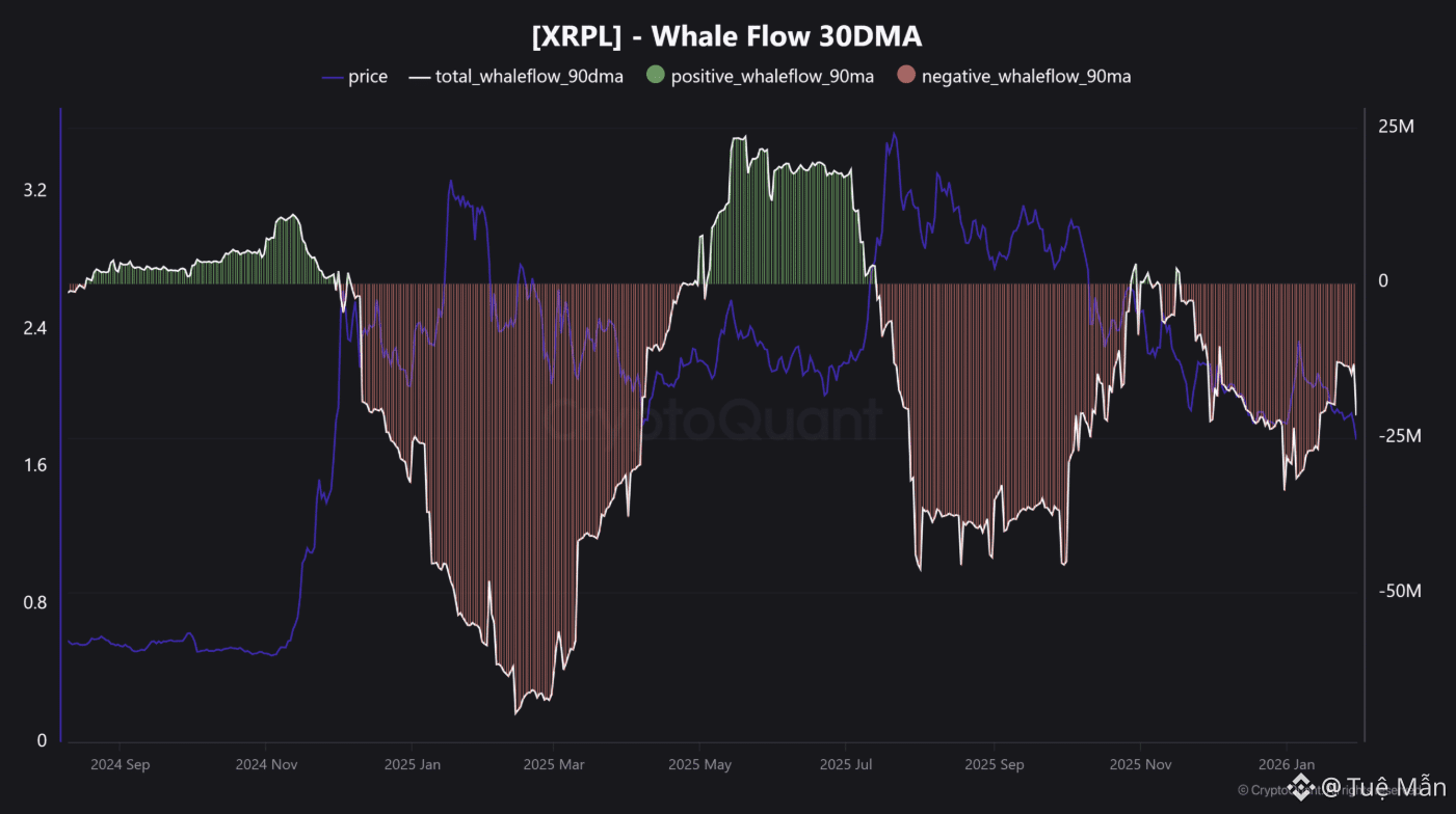 Tuy nhiên, theo chỉ số XRPL Whale Flow trong 30 ngày, các “cá voi” XRP quy mô lớn vẫn đang duy trì trạng thái bán ròng ở thời điểm hiện tại. Dù vậy, áp lực xả hàng đã có dấu hiệu suy yếu trong tháng 1, khi chỉ số này từng bước cải thiện và dịch chuyển theo hướng tích cực hơn.