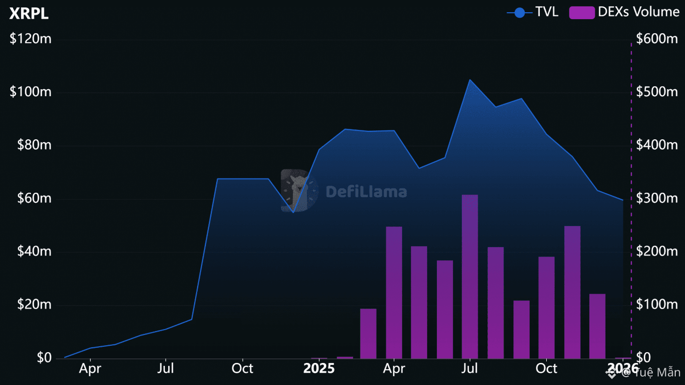 Tại thời điểm viết bài, tổng giá trị bị khóa (TVL) của DeFi trên XRPL đã sụt giảm mạnh, từ khoảng 100 triệu USD xuống chỉ còn 60 triệu USD.