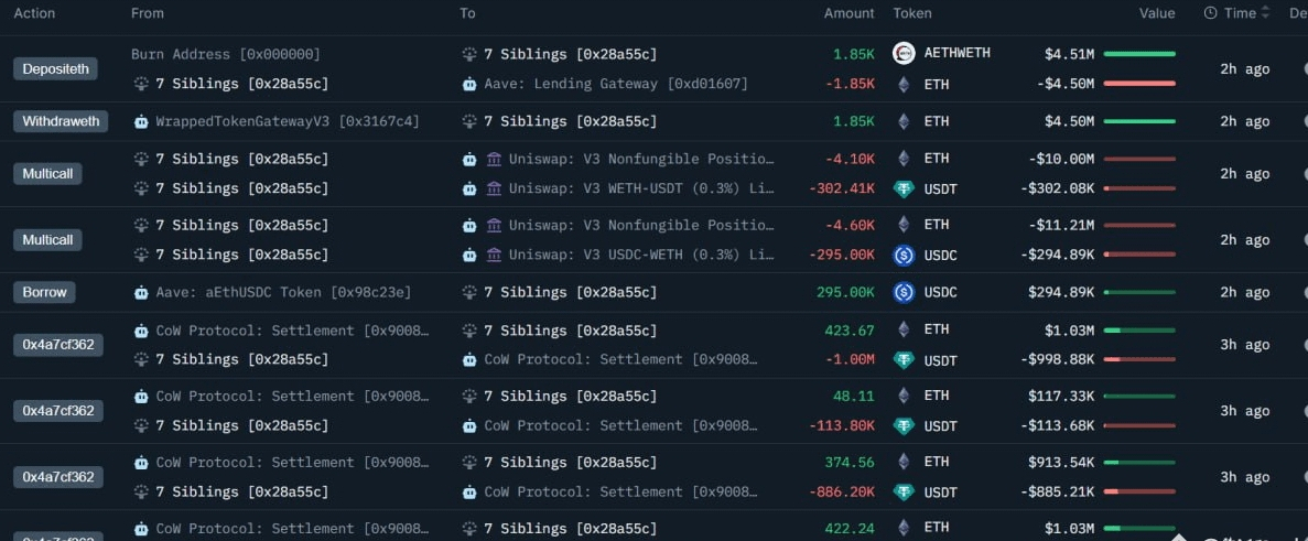 Il flusso della transazione rivela dettagli importanti sull'intento. I fondi sono stati presi in prestito tramite Aave, quindi instradati attraverso i pagamenti del Protocollo CoW, confermando che si trattava di una strategia di accumulo spot con leva, non di un'operazione su derivati o futures speculativi. Gli acquisti sono stati deliberatamente suddivisi su più portafogli ed eseguiti in più tranche, un segno classico dell'esecuzione strutturata delle balene progettata per minimizzare lo slittamento e evitare di attirare l'attenzione durante i momenti di debolezza.