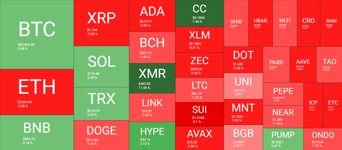 La maggior parte delle prime 36 altcoin non-stablecoin sono in rosso oggi. Ethereum fatica sotto $2,650 dopo un altro calo del 3% giornaliero. XRP è sceso a $1.70 dopo un calo del 2.5%. ADA, DOGE, LINK, BCH, XLM, ZEC e AVAX sono anch'essi in rosso fino al 4%, mentre SUI è crollato di oltre il 5%.