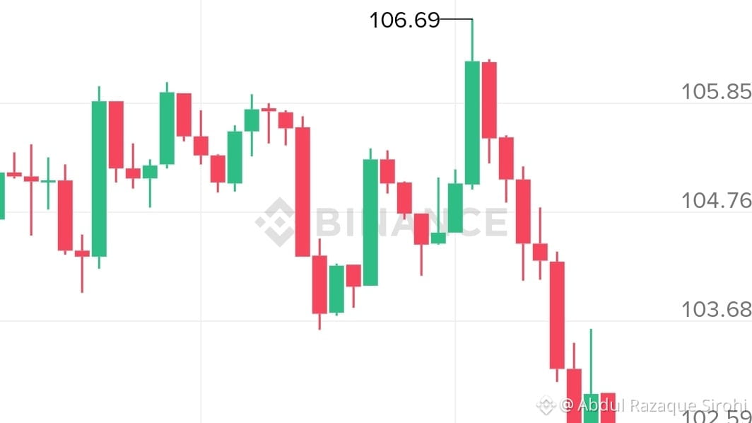 La Forte Reiezione: $SOL ha subito una pesante reiezione a $106.69, portando a una serie di aggressive candele rosse nel grafico a 15 minuti.
