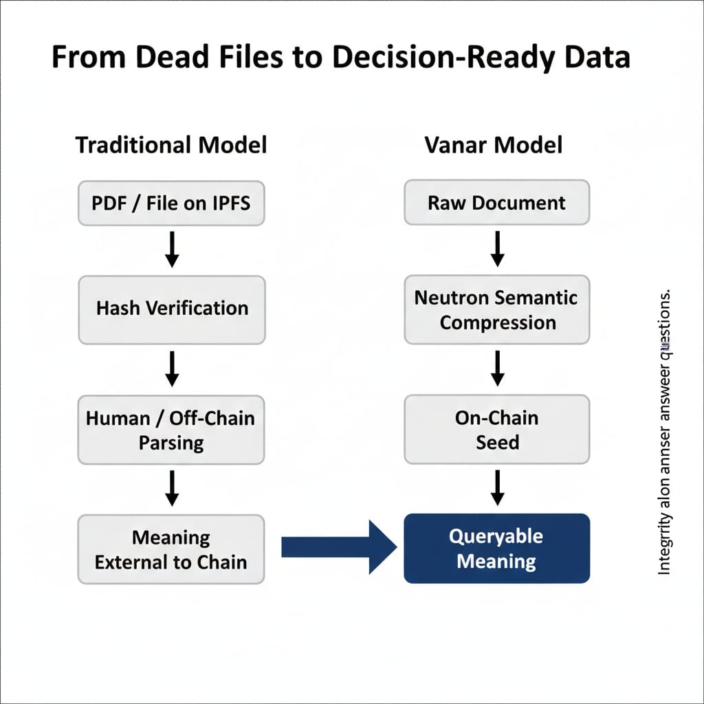 In parole semplici: Vanar preferisce che la catena sia un luogo dove i dati possano essere compresi e agiti piuttosto che essere semplicemente referenziati.