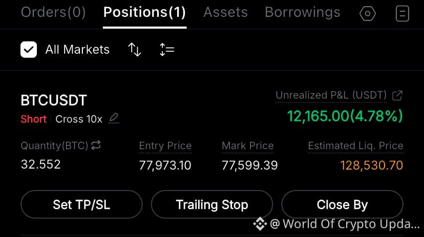 Ho seguito da vicino questo movimento #BTC, e la mia analisi mi ha portato a una posizione Short ad alta convinzione al livello di $77,973.10. Rimanendo paziente e non inseguendo l'hype, sono riuscito a catturare una significativa tendenza al ribasso che attualmente sta portando risultati enormi.