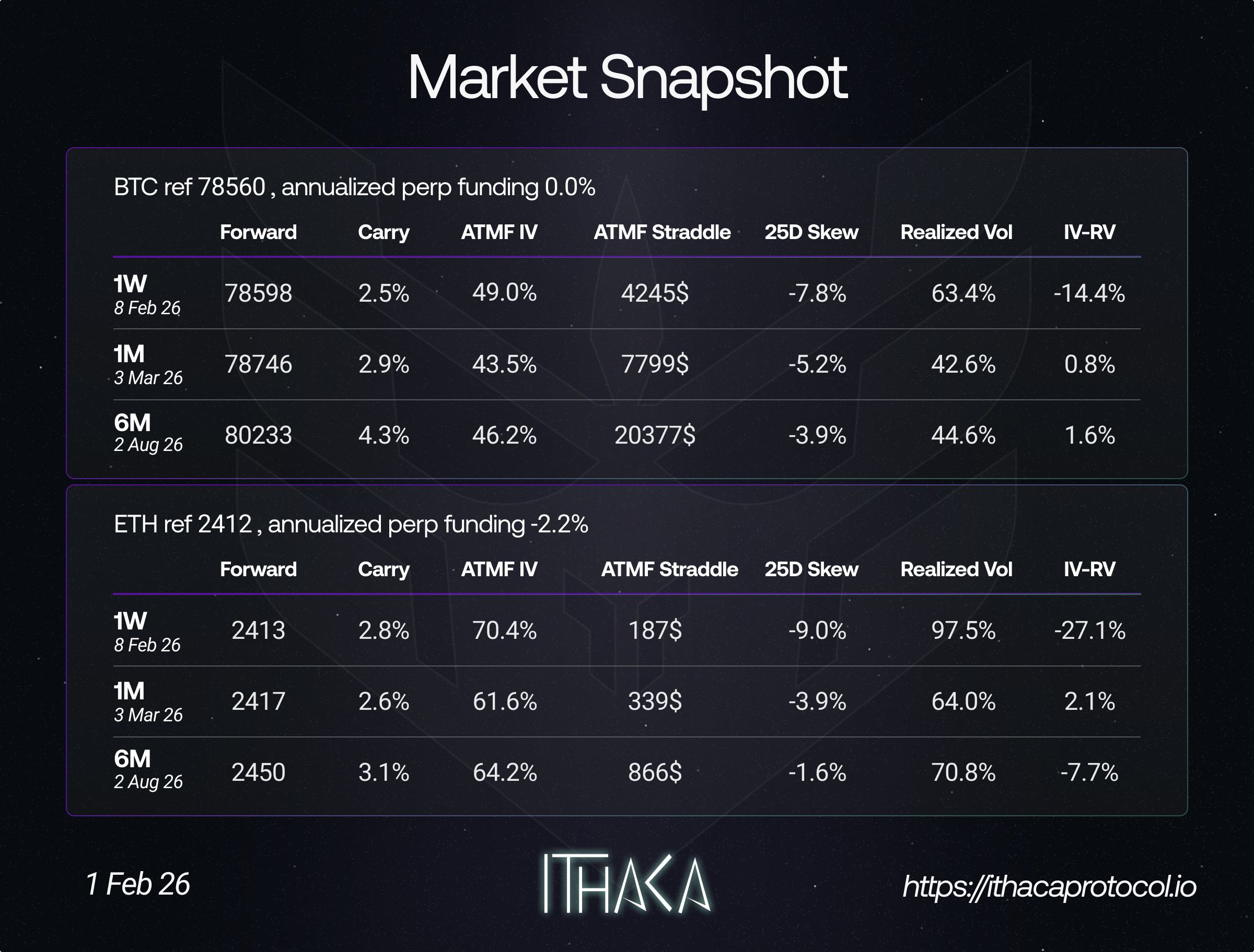 In sintesi: fase di shock della volatilità. BTC è più vicino all'equilibrio, ETH sta ancora assorbendo rischio.