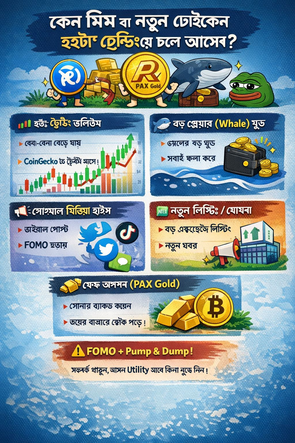 Sui social media ci sono molti giochi, soprattutto. Se un post diventa virale, le meme coin si diffondono rapidamente e si crea FOMO per i nuovi token. Nel caso delle meme coin, la comunità e l'hype sono le cose principali, anche se in realtà non ci sono utilità.