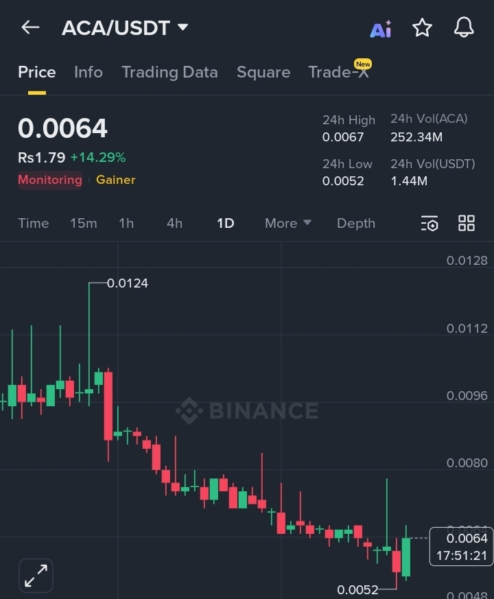 Binance ha recentemente posto un Tag di Monitoraggio su $ACA (come visto nel tuo screenshot). Questo di solito segnala un rischio maggiore e un potenziale delisting se gli standard non vengono soddisfatti.
