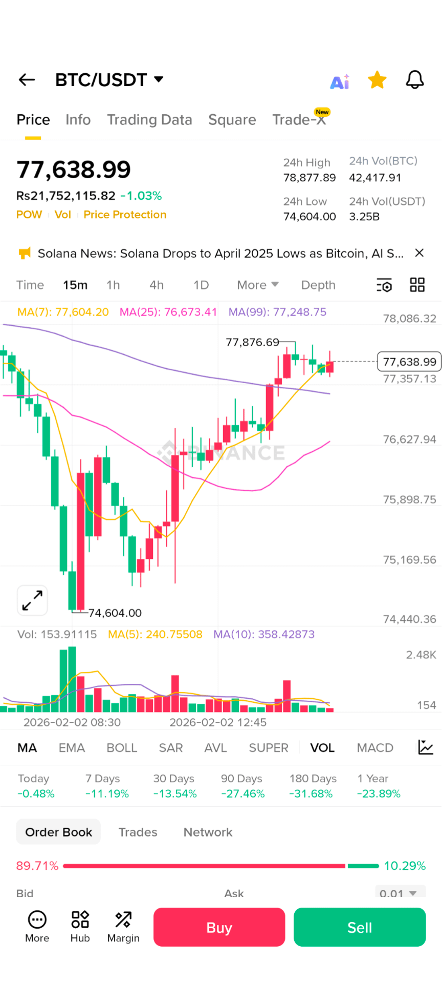 BTC si aggira intorno ai ~$77,000 USD oggi. Questo riflette un movimento verso il basso piuttosto che un grande pump.