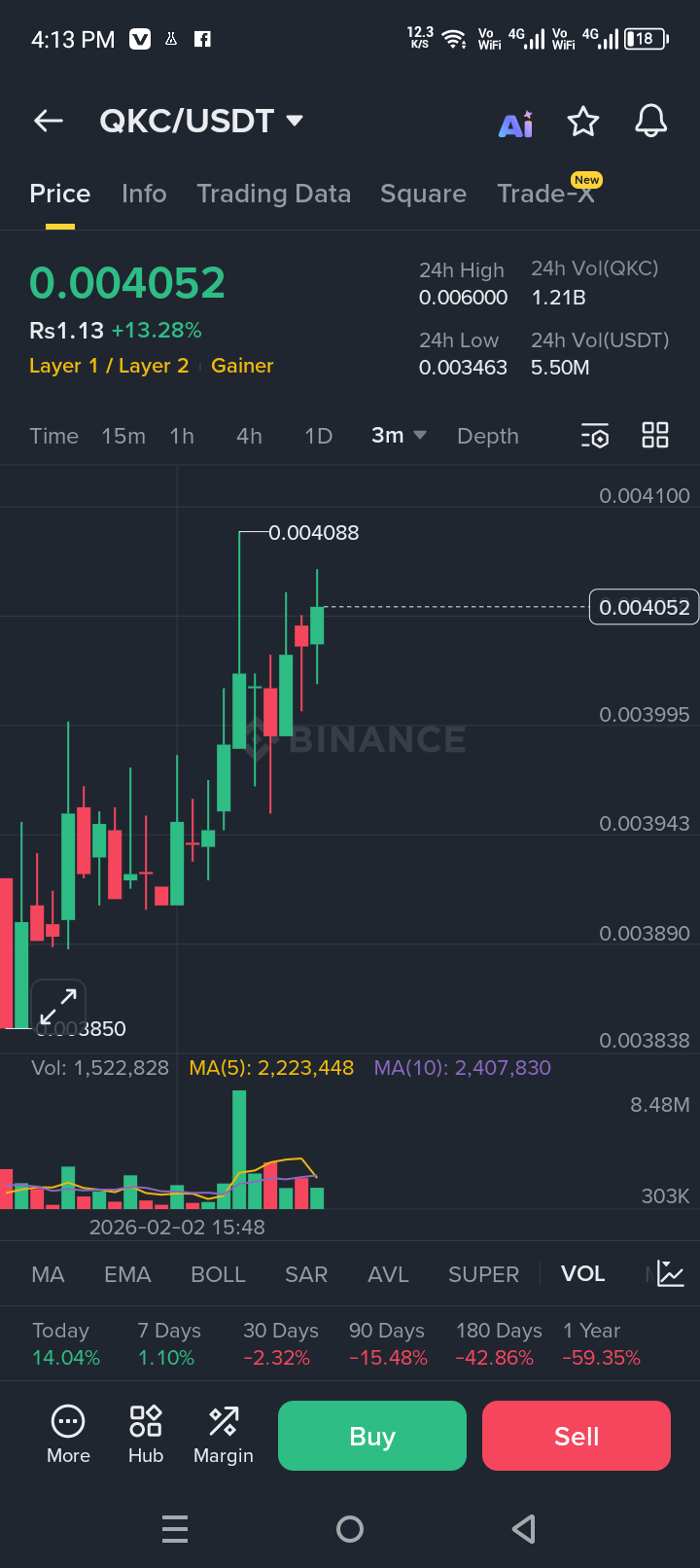 Nel grafico a 3 minuti, QKC ha **superato la resistenza precedente vicino a 0.00390–0.00400**, che in precedenza fungeva da zona di offerta. Una volta che il prezzo ha superato questo livello, i compratori sono intervenuti in modo aggressivo, innescando un rally di breakout.