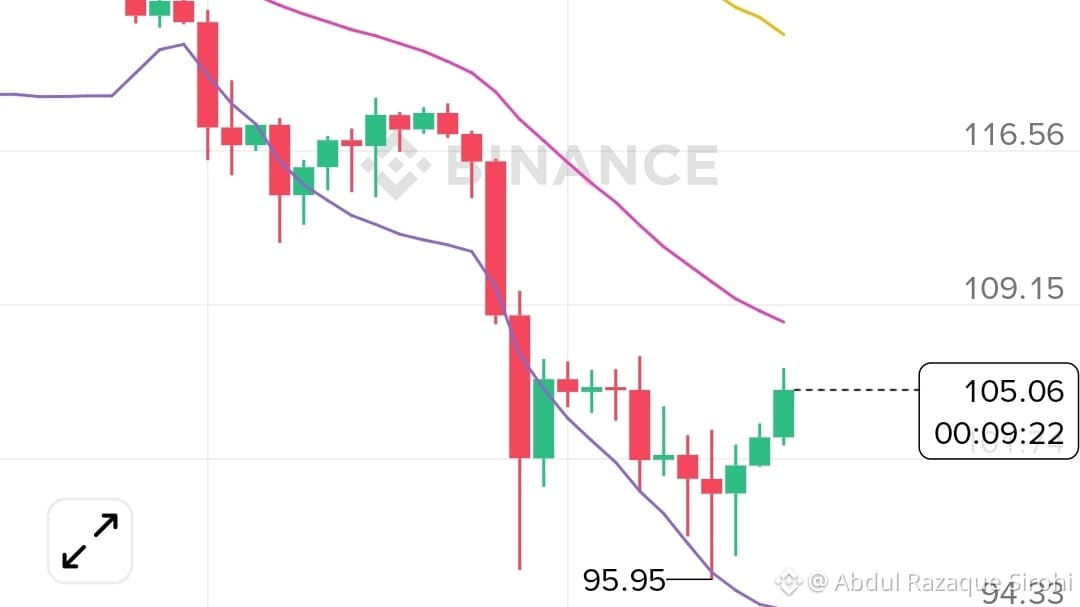 L'azione attuale del prezzo: $SOL sta attualmente scambiando a $105.06, in aumento del +3.58% nella giornata. Dopo aver raggiunto un minimo locale di $95.95, il prezzo sta testando la banda media di Bollinger (MB: 108.33).